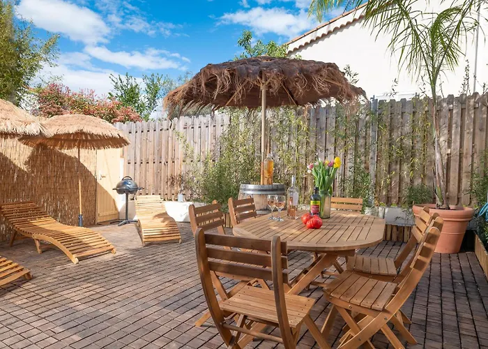 Appartement 6 pers Jardin Privé La Cabane Bambou - Mandara Beach, Antibes French Riviera est équipé d'une kitchenette. Ce logement est à seulement 24 minutes de route de l'aéroport de Nice-Côte d'Azur. La résidence offre un solarium pour le rafraîchissement.